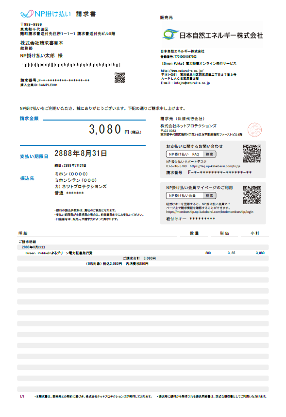 株式会社ネットプロテクションズの提供する「NP掛け払いサービス」を介して、グリーン電力証書のお支払いを、ご利用月の翌月末までにネットプロテクションズ指定の銀行口座でお支払いいただきます。