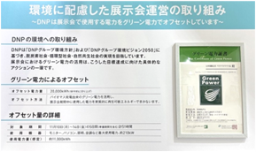 ブースの構成材や展示什器には、自社工場から排出された不要物を再利用したリサイクル素材を活用。また、出展にあたって使用する空調や照明などのエネルギー使用量を見える化し、グリーン電力証書を活用した再生可能エネルギー利用の取り組みも実施しました。